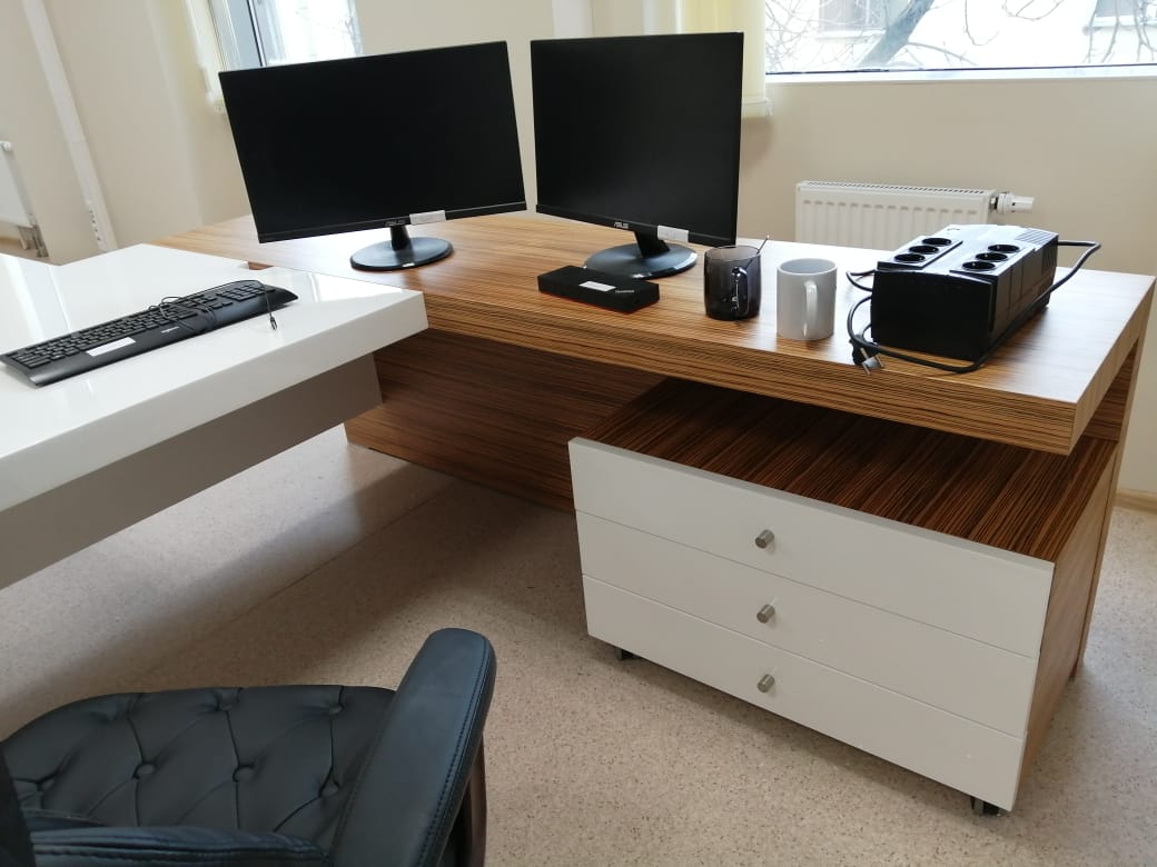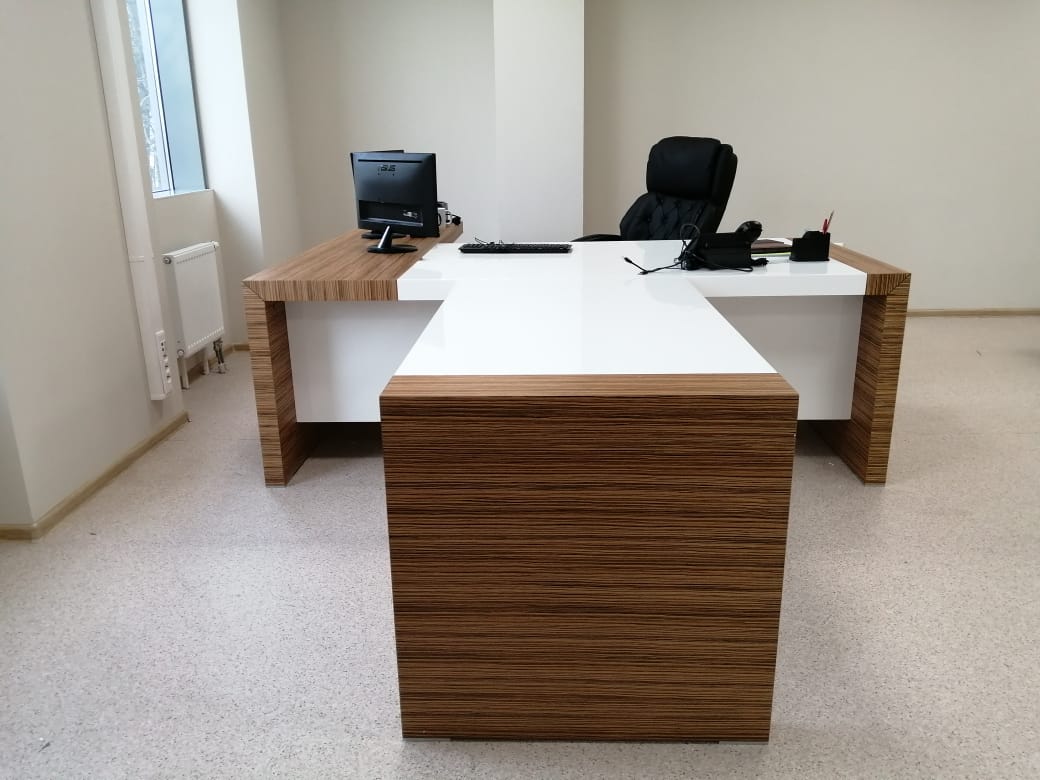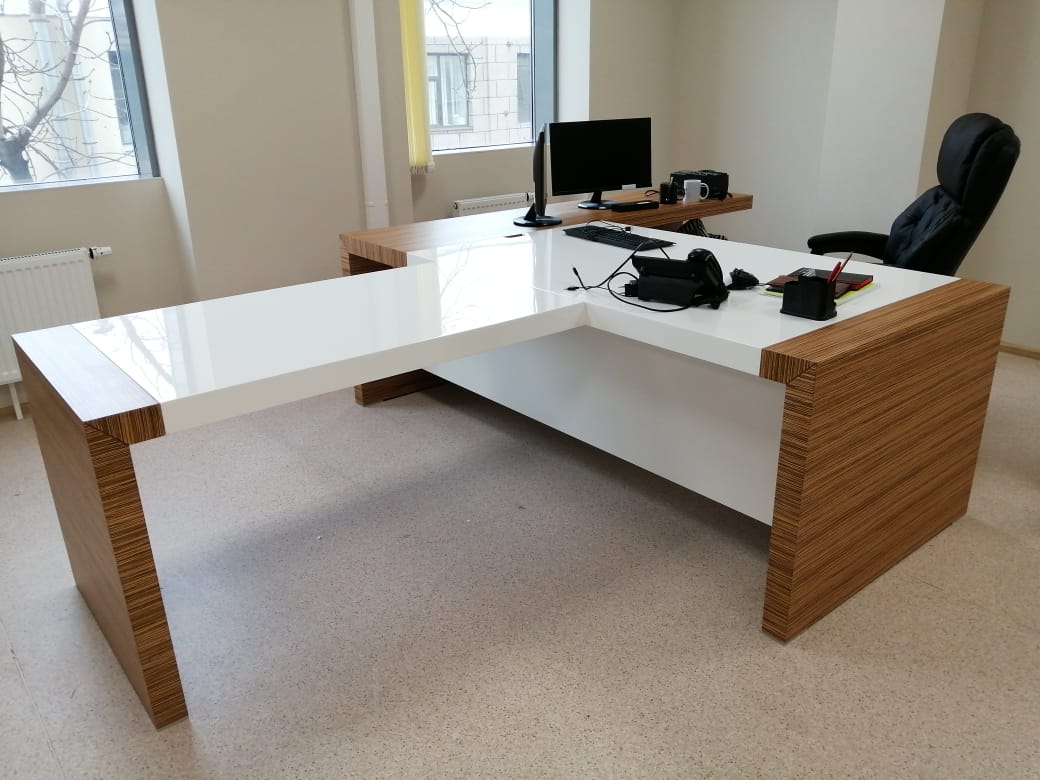 А дизайн коллекции KYU из руководительской мебели интересен сочетанием шпона экзотического зебрано с белой глянцевой покраской.